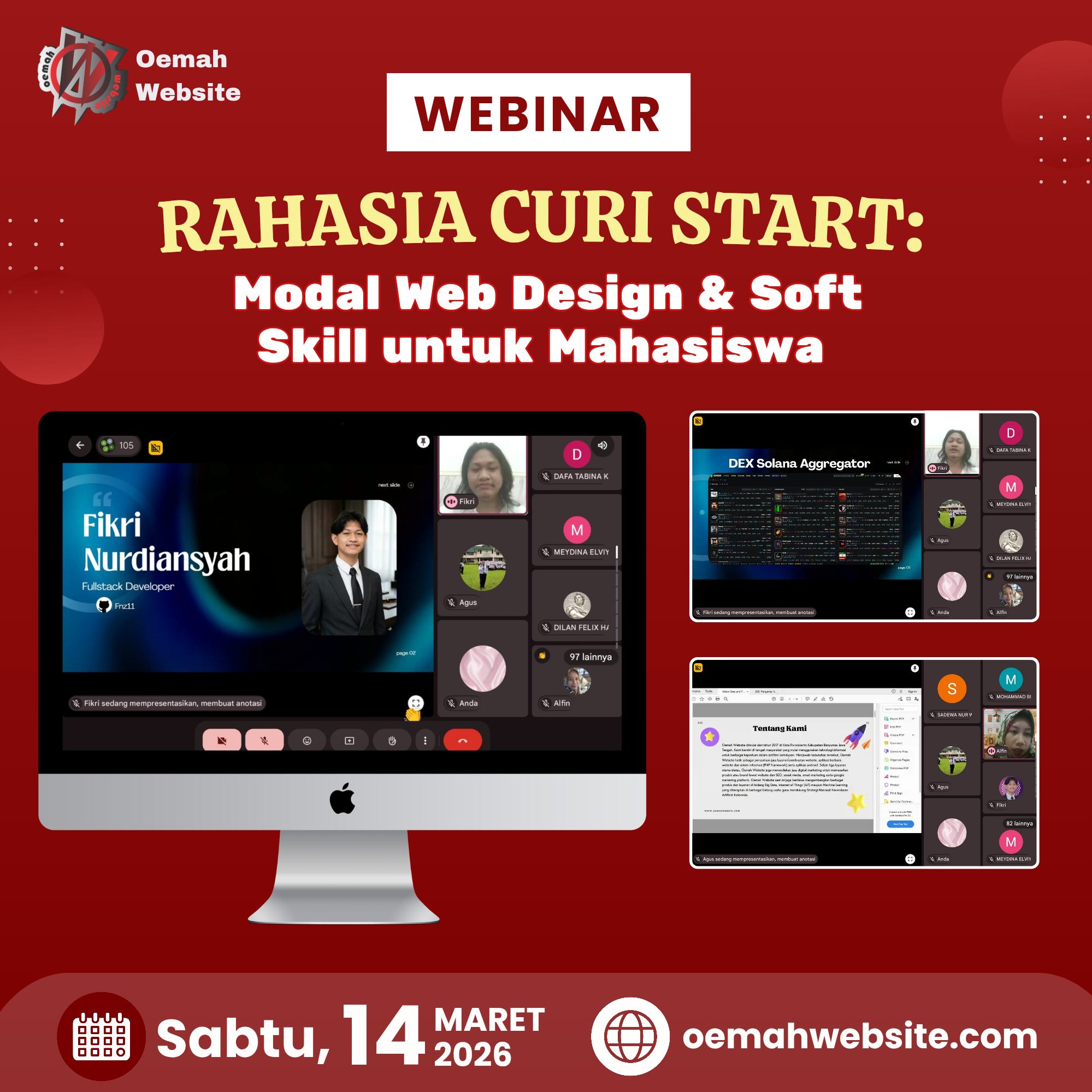 Webinar bertajuk “Rahasia Curi Start: Modal Web Design & Soft Skill untuk Mahasiswa” sukses diselenggarakan secara daring pada Sabtu, 14 Maret 2026 melalui platform Google Meet. Kegiatan ini diinisiasi oleh Oemah Website sebagai bagian dari upaya berbagi pengetahuan serta memberikan wawasan kepada mahasiswa mengenai pentingnya keterampilan digital dan pengembangan soft skill dalam menghadapi dunia kerja yang semakin kompetitif. Webinar ini terbuka untuk mahasiswa maupun masyarakat umum dan berhasil menarik antusiasme tinggi dengan dihadiri oleh ratusan peserta dari berbagai perguruan tinggi.